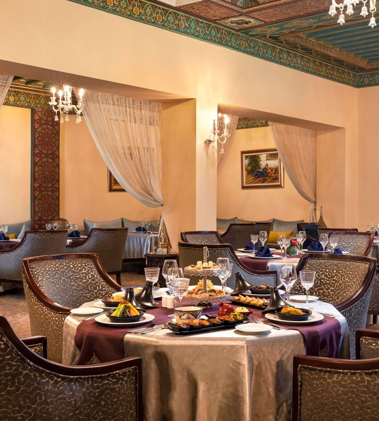 Notre restaurant marocain revisite la cuisine traditionnelle marocaine avec l'inspiration de notre chef exécutif pour votre plus grand plaisir. Découvrez nos différentes spécialités à travers un dîner à la carte, offrant un choix varié de plats pour satisfaire toutes les envies culinaires. Avec 60 places disponibles, notre restaurant est idéal pour une soirée intime en couple ou un repas de groupe. Venez savourer l'art et la manière de partager les saveurs marocaines et réservez votre table dès maintenant.