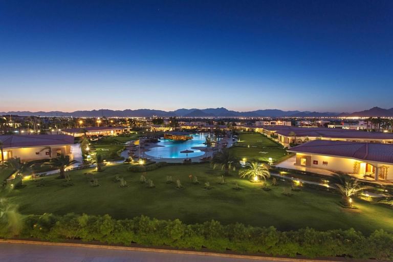 Serene dusk view of Pickalbatros Golf Beach Resort, with lush lawns, a glowing pool, palm trees, and distant mountains